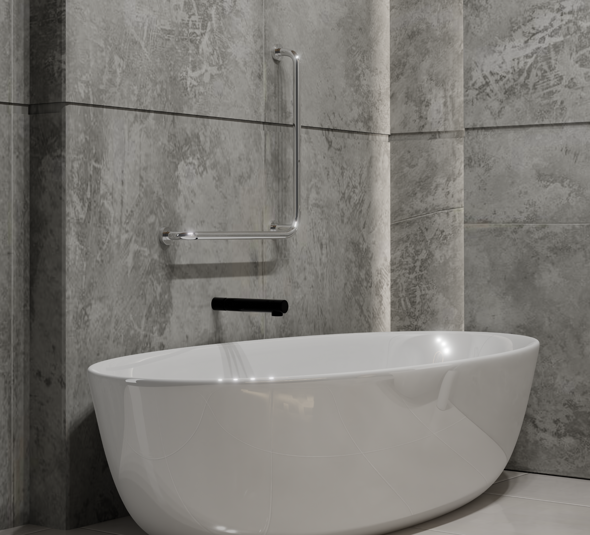 A barra de apoio 90° pode ser utilizada isoladamente ou em conjunto com outras barras, criando um sistema completo de apoio conforme a necessidade do ambiente.