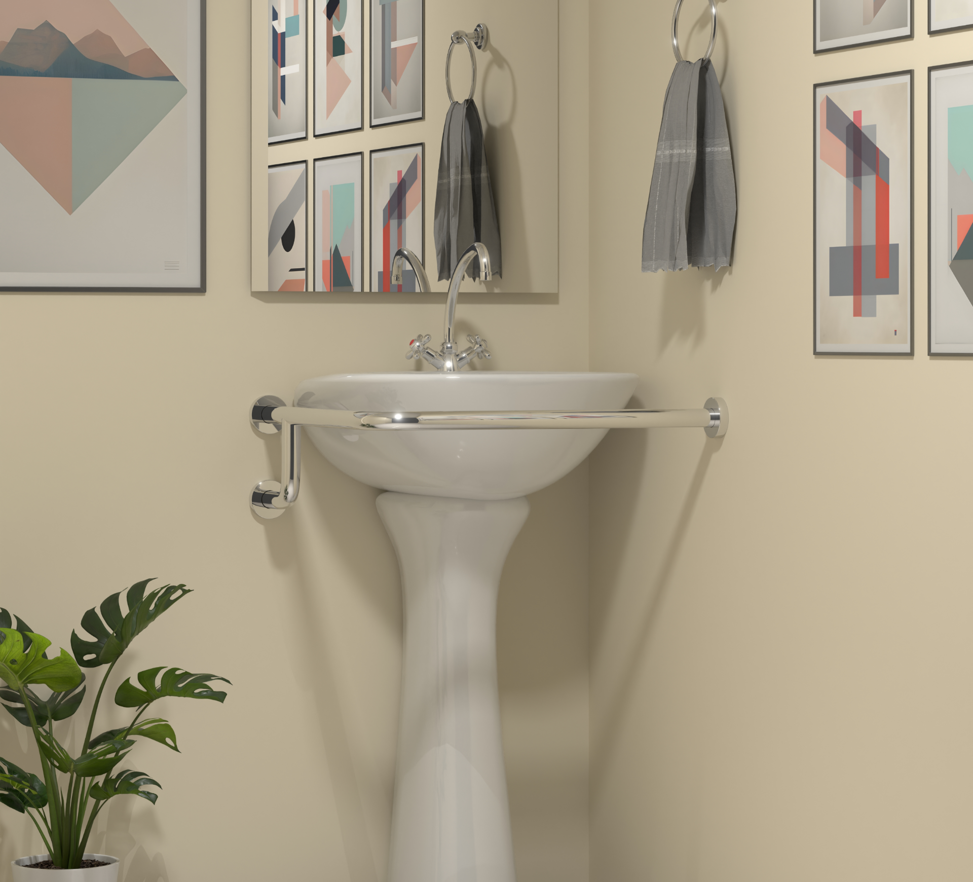 A barra de apoio para lavatório de canto é instalada nas paredes laterais ao lavatório, acompanhando o posicionamento da cuba e garantindo apoio ao usuário durante o uso.