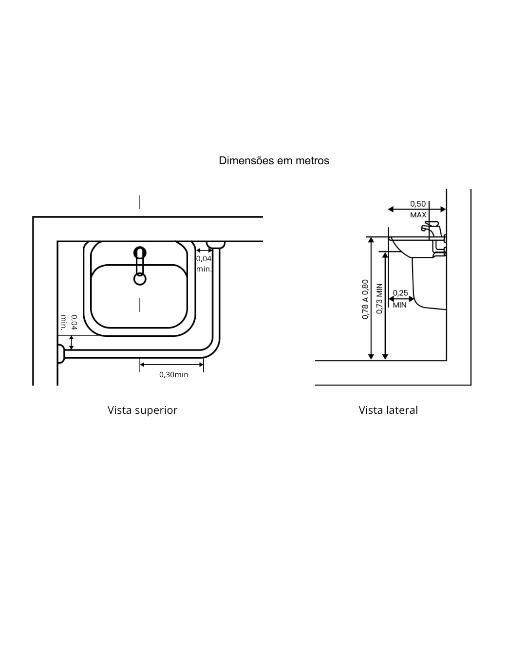 O posicionamento deve sempre garantir que o usuário consiga se aproximar do lavatório sem interferências, mantendo espaço livre para circulação e uso frontal.
