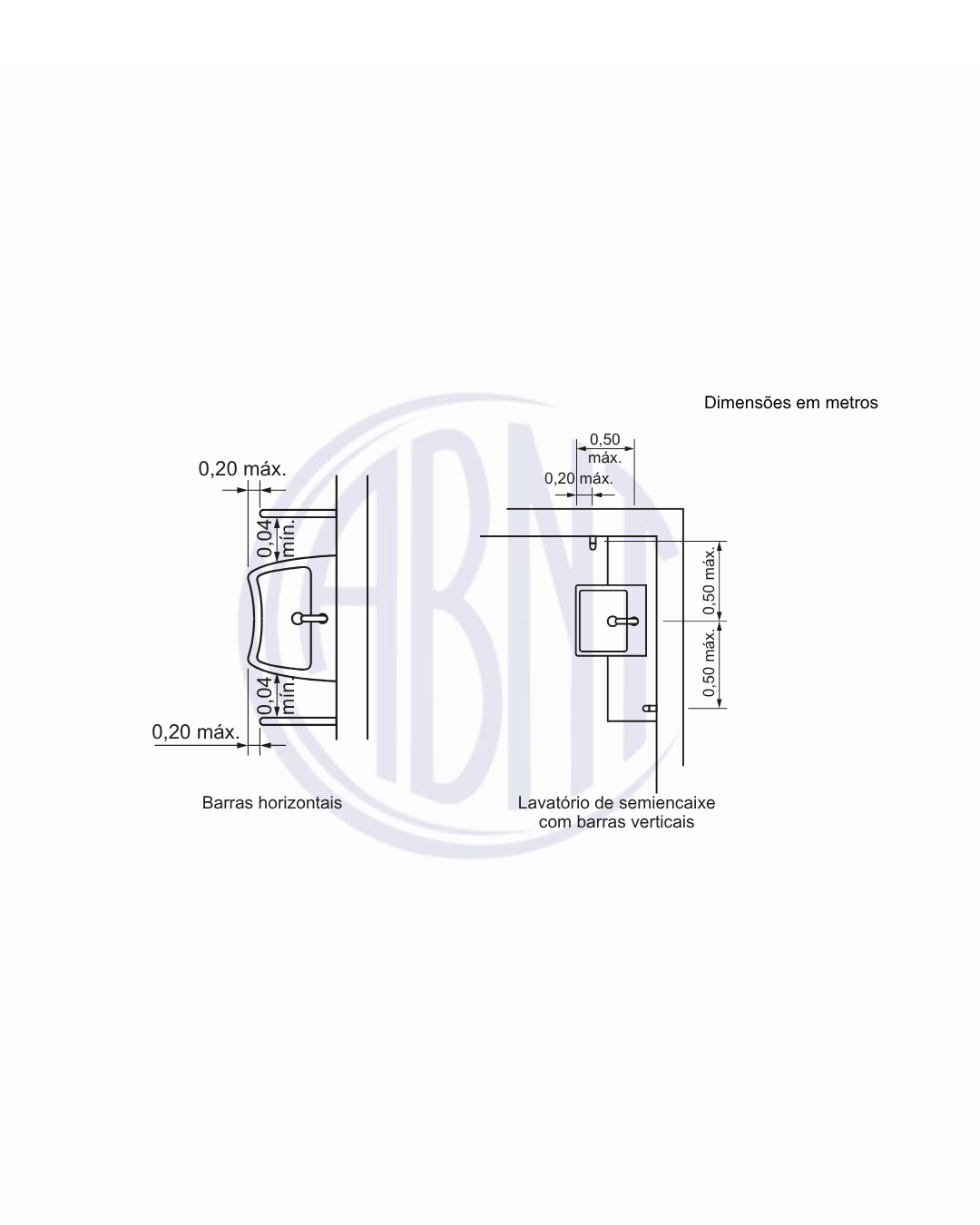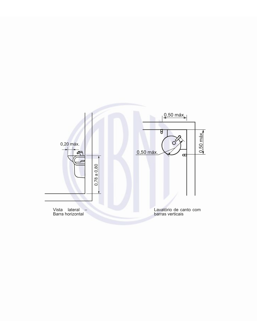 Em configurações com barras verticais, estas devem ser instaladas próximas ao lavatório, com distância máxima de 50 cm da borda, permitindo apoio em diferentes alturas e facilitando o equilíbrio do usuário.