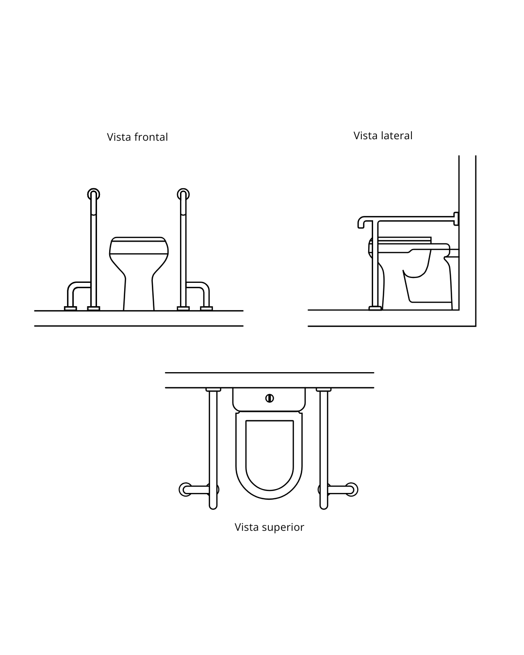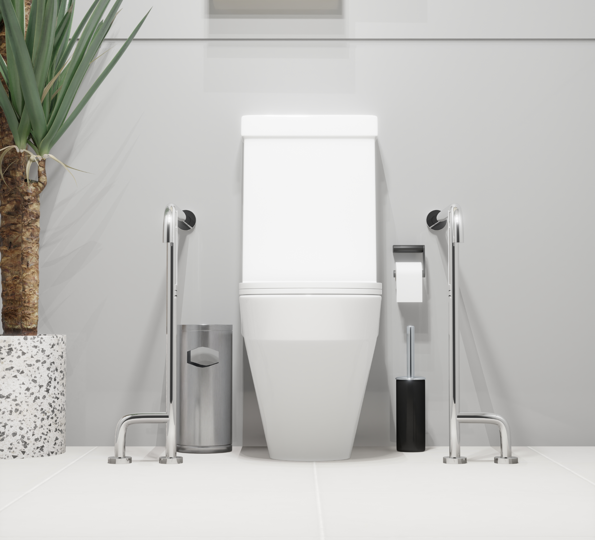 Seu formato em "T" é projetado para instalação ao lado do vaso sanitário com fixação no piso, proporcionando múltiplos pontos de apoio, maior estabilidade e segurança durante o uso.